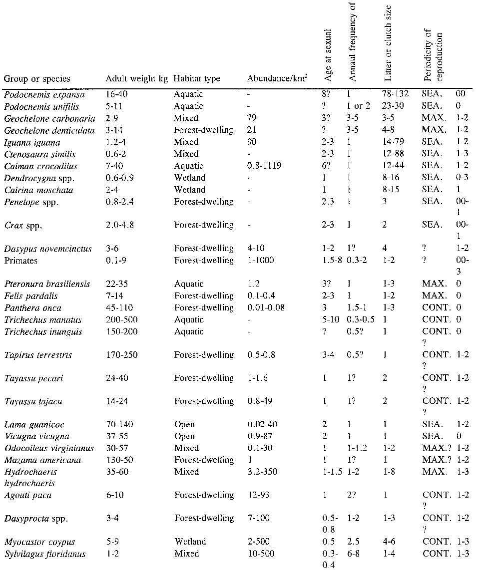 Looking at the list of breeding statistics in Table 27, we note a series of long-lived species which reach sexual maturity late and are generally not very prolific, but which do live long lives in the wild under favourable conditions. Into this category we can put Podocnemis, Geochelone, Caiman, Penelope, Crax, the big primates, Pteronura, Panthera, Trichechus and Tapirus. Within their taxonomic groups these species are usually the largest ones. They are also alike in that they are closely dependent on primary habitats, whether aquatic or forest. They are well-adapted to their own primary ecosystems and can maintain stable populations and achieve high biomass in their native habitats. In ecology this is known as the strategy of K-selection. At the same time, K-selected species are not tolerant of habitat modification, and their low reproductive capacity makes them extremely sensitive to increased adult mortality from hunting. Managing these populations through sustained harvesting is therefore extremely difficult and would depend entirely on stringent conservation measures in the primary habitat. Additionally, these animals are usually the largest and preferred game animals in their respective ecosystems, and therefore those most affected by commercial and subsistence hunting. Many representatives of this category are critically scarce: 10 of the 11 vulnerable or endangered taxa in Table 27 answer to the profile of K-selected species.