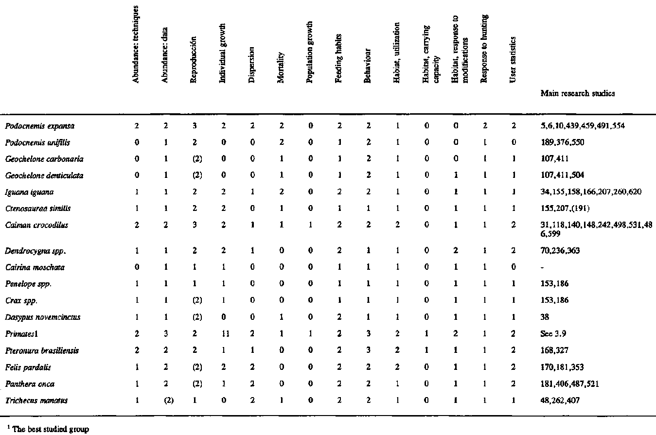 The current status of the key groups and species compared in the last column of Table 27 is highly variable. Several species are currently in a very tight spot, whereas others, while scarce in some areas, can be common or abundant in others. Clearly, the prime management option for each local population and/or species depends on its status. Thinking along these lines, the sole immediate management objective should be to guarantee survival, and, where possible, secure the recovery of all vulnerable and endangered species and/or populations. For scarce but still not imperilled populations such as Geochelone, many iguana populations, Caiman crocodilus, Cairina, the cracids, various primates, Tapirus and many populations of Tayassu, Lama guanicoe, Odocoileus, Mazama and the big rodents, the priority objective should be to avoid degradation and to re-establish abundance and productivity at levels compatible with land use in each case. Finally, where there are solid indications that a species or population is common or abundant, the conditions will obtain for utilization for the maximum collective benefit, subject to the principle of sustainable harvest, constant monitoring and any necessary changes in order to conserve resource productivity. This objective may be applicable, for example, for certain iguana populations, Caiman, Dendrocygna, Dasypus, Tayassu, Lama guanicoe, Odocoileus, Mazama, Hydrochaeris, Agouti, Dasyprocta, Myocastor and Sylvilagus.