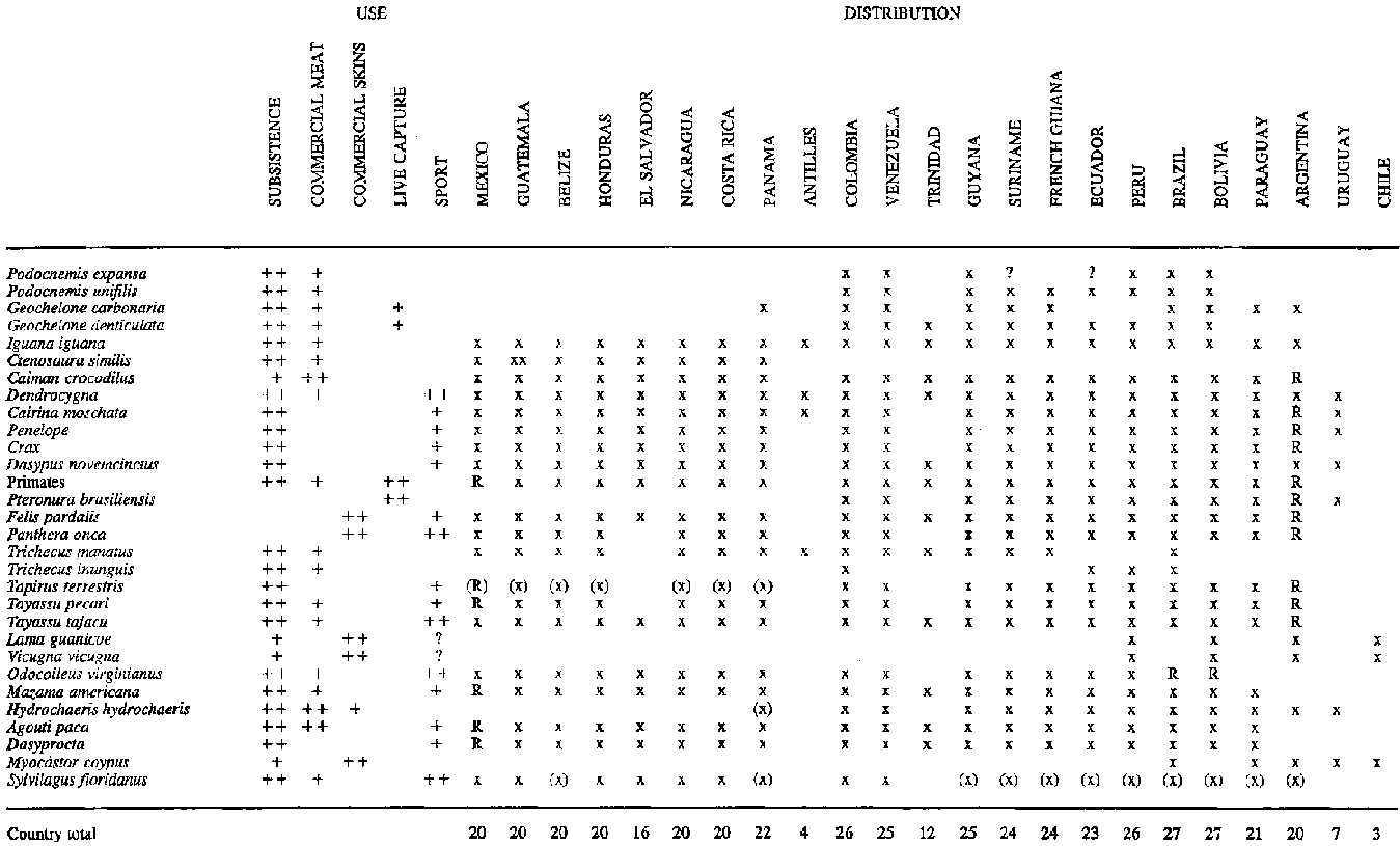After reviewing the patterns of use and selection criteria mentioned above (1.1) a list of 30 key groups or species of Latin American wildlife was drawn up for more detailed analysis and presentation (Table 22). It covers the animals preferred for food in the rural sector. It also includes some species of high commercial value for their hides or skins. But it underrepresents species preferred by sports hunters, e.g. doves and partridges, tinamous or Gallinaceae.