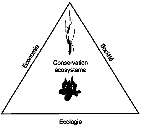 En matière de conservation des écosystèmes, toutes les utilisations potentielles de la terre et toutes les méthodes ont de l'importance. La plupart des sites écologiques peuvent être polyvalents et offrir des avantages divers. Pour atteindre effectivement la plupart des objectifs de protection de l'environnement et de la ressource, il faut les considérer à l'échelle géographique la plus vaste, celle des paysages ou de la région. A cette échelle, les populations font partie des écosystèmes et doivent trouver quelque part des ressources pour satisfaire leurs besoins, et certaines portions de ces écosystèmes-paysages doivent conserver leurs irremplaçables valeurs écologiques. Par conséquent, toutes les portions du paysage et toutes les pratiques susceptibles de conserver les écosystèmes ou de satisfaire les besoins et les aspirations des gens sont potentiellement importantes (figure 14).