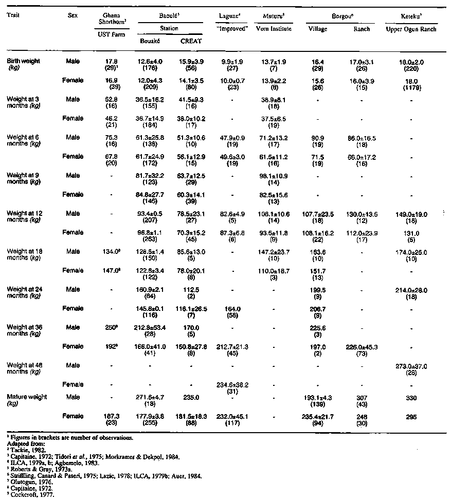 Birth weights of the Ghana Shorthorns have ranged from 17 to 20 kg (Tables 1 and 2). Growth rates in the literature reviewed varied considerably, as did weaning and mature weights. In general, the performance of the Ghana Shorthorn (or Savanna type) has been better than that of the Dwarf (Forest) type. The wide range (64 to 154 kg) in weaning weights of Ghana Shorthorns may be the result of the variation (seven to nine months) in weaning age, in addition to differences in management. Supplementation studies have shown that proper feeding can improve the growth performance of these breeds. Mature weights on-station ranged from 163 to 380 kg and were, on average, higher than those on-farm, which varied from 170 to 200 kg. The lower estimates compared well with the estimate of 165 kg reported by Montsma (1959) for a sample of 40 Ghanaian Dwarf Muturu. The variation in mature weights may be associated with the lack of precise age at maturity for these breeds (Montsma, 1962; Ngere and Cameron, 1972; Osei and Effah-Baah, 1989; Ahunu et al., 1993; Humado, 1976).