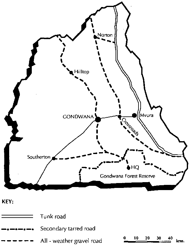 There are two tarred roads in the district: the main trunk road from Alfa to Omega, which follows the edge of the Mvura valley; and the road from Mvura to Gondwana, which goes on to Southerton. Most parts of the district are reasonably well served by all-weather gravel roads. The exception again is Zone V, which is very isolated because the only access is a poor quality earth road which is often impassable when there is heavy rain in the hills.