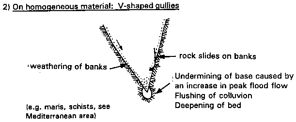 2) On homogeneous material: V-shaped gullies