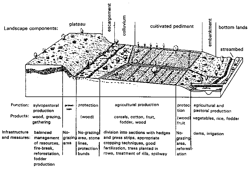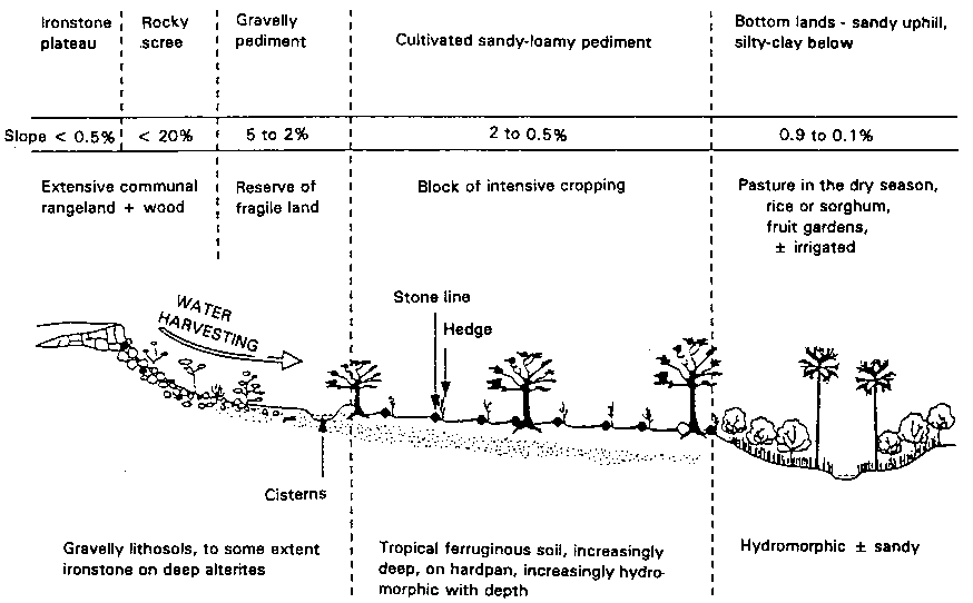 FIGURE 62 Diagram showing improved use of a hillslope in Minianka country: an example of rainfed farming proper (cf. Hijkoop, Poel and Kaya 1991)