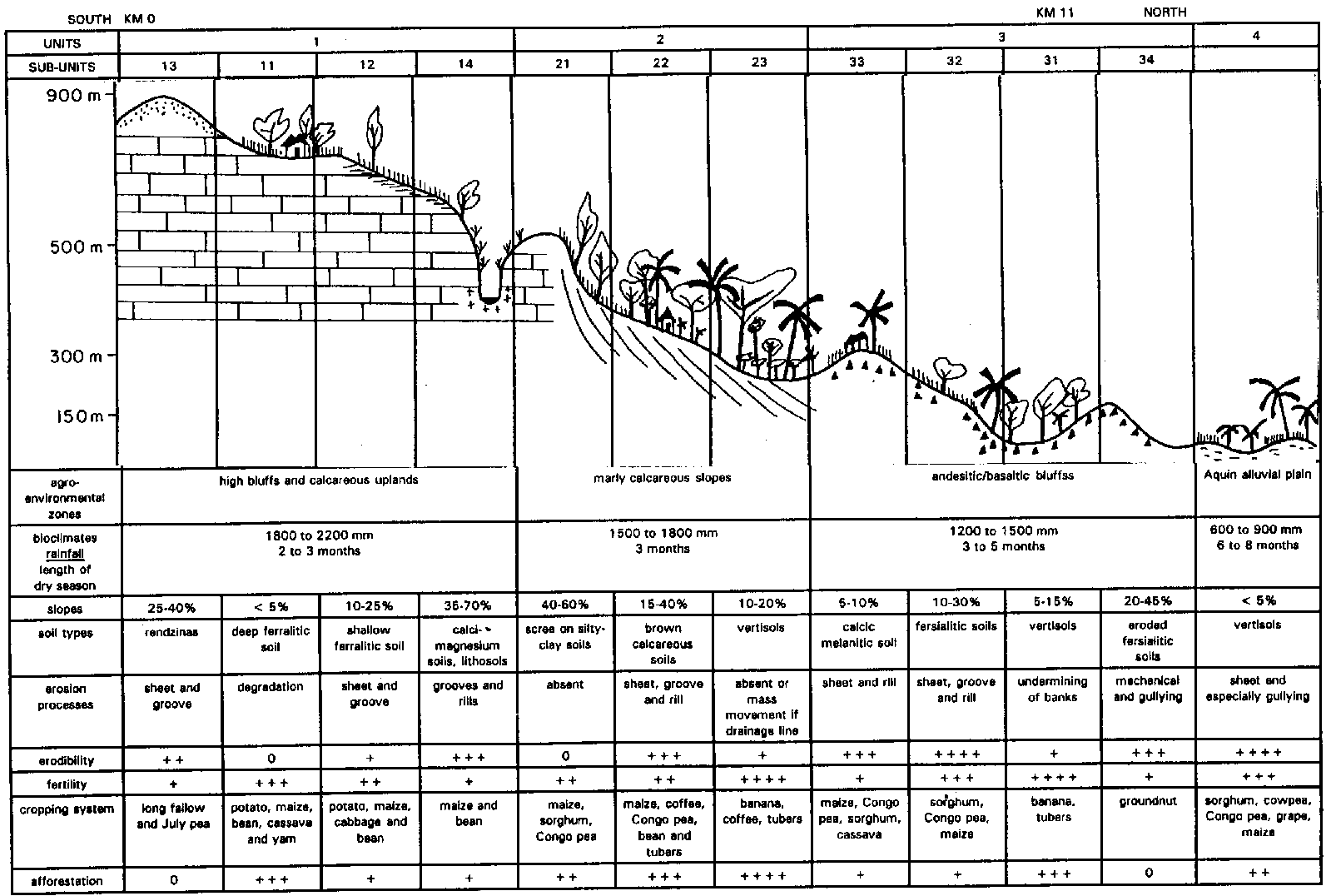 Unit 3: andesitic or basaltic bluffs. This unit is less well-watered (1200 mm/yr) and below 300 m in altitude. A fairly marked dry season makes only one cropping season possible: sorghum, groundnut, Congo pea, and sometimes maize. The soils of volcanic origin are very well-suited to agriculture; however, they are often found on slopes, exposing them to strong sheet erosion from diffuse runoff or groove and rill erosion.