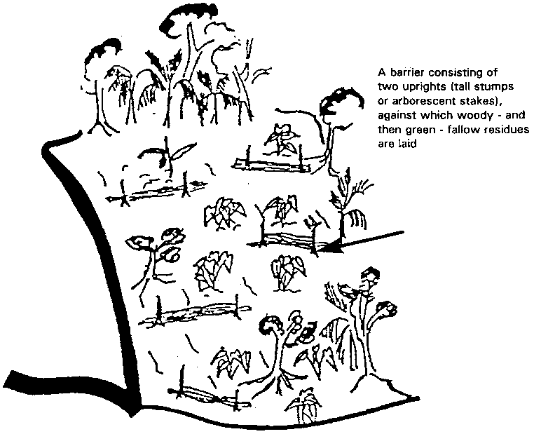 Straw barriers are widely used, but to little effect. These small barriers (Figure 80) are made by sticking two wooden posts into the ground, then laying other woody residues between them, interwoven with green fallow residue after clearing. These structures are not permanent and can have no cumulative effect over the years. Moreover, they are only roughly horizontal, and are too permeable.