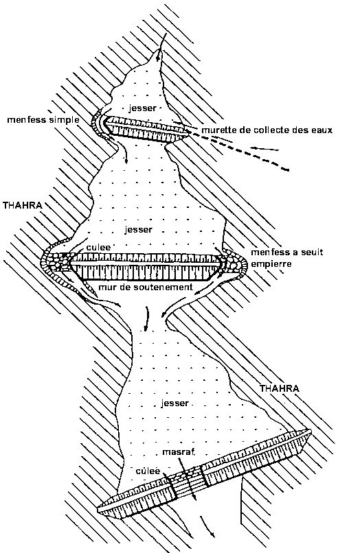 Il distingue en amont des bassins, les "tabias", bourrelets de terre de forme trapézoïdale, armés à l'aval d'un mur de pierres et sur les côtés, d'un exutoire empierré, haut de 2 à 5 m qui barre une vallée de quelques dizaines de mètres de large. Derrière la tabia qui sert de chemin (rass), s'accumulent les eaux de ruissellement et des sédiments limono-sableux délimitant le jessour, sorte de champ bien alimenté en eau, où croissent des cultures annuelles (orge, pois, lentilles, fèves, pastèques) à l'ombre d'arbres bien adaptés aux apports sédimentaires successifs (figuiers, oliviers, grenadiers, amandiers) (figures 33 et 34).