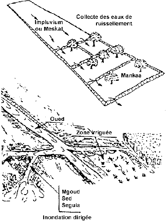 Dans les pays semi-arides où la pluviosité ne permet pas la culture sur l'ensemble du versant, on réserve une partie de ce dernier pour favoriser le ruissellement, lequel est récupéré en aval pour irriguer des surfaces réduites, compléter les apports pluviométriques et améliorer la sécurité de production des cultures (Hudson, 1990).