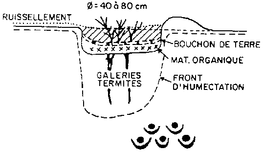 Le zaï est une méthode traditionnelle complexe permettant la récupération des sols dégradés sur les glacis sablo-limoneux qui allient la capture du ruissellement et la localisation de la fumure et de l'eau disponible dans des cuvettes avec la complicité des termites. Il existe de nombreuses variantes de zaï dont le zaï forestier, particulièrement bien adapté pour introduire l'agroforesterie en zone soudano-sahélienne (figure 5).