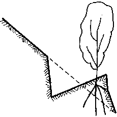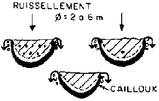 Le système probablement le plus connu d'impluvium permettant de récolter de l'eau sur des courtes pentes pour irriguer une culture d'arbres, est certainement les micro-bassins (figure 40). L'élément de base est une petite excavation formant un bassin d'infiltration et une bordure formée d'une diguette en terre de 20 cm de haut tandis que le bassin aurait 40 cm de profondeur. Les diguettes peuvent avoir une forme en V ou en demi-lune. En Israël, dans un nouveau verger, la zone d'infiltration serait de l'ordre de 4 x 4 m, tandis que l'impluvium aurait 3 à6 fois plus de surface.