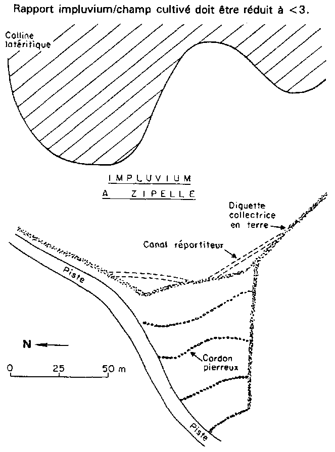 Le ruissellement provenant de l'impluvium formé par des collines ou par le parcours, peut aussi être capté par une digue en terre et irriguer un champ aménagé en cordons de pierres. Pour que ce supplément d'eau, distribué pendant l'averse sur un champ qui tend déjà à ruisseler par lui-même, ne provoque pas de ravinement, il faut réduire le rapport surface impluvium sur champ cultivé à moins de trois dans la zone des 400 à 600 mm de pluie, et ralentir la nappe ruisselante à moins de 25 cm/sec., à l'aide d'une série de cordons pierreux disposés tous les 20 m (figure 39). Ce dernier mode de gestion des eaux de ruissellement est cependant délicat car en année sèche, l'impluvium risque d'être insuffisant pour nourrir les grains et en année humide, les apports d'eau trop abondants risquent de réduire la production par engorgement temporaire du sol (Hudson, 1990) et casser les digues.