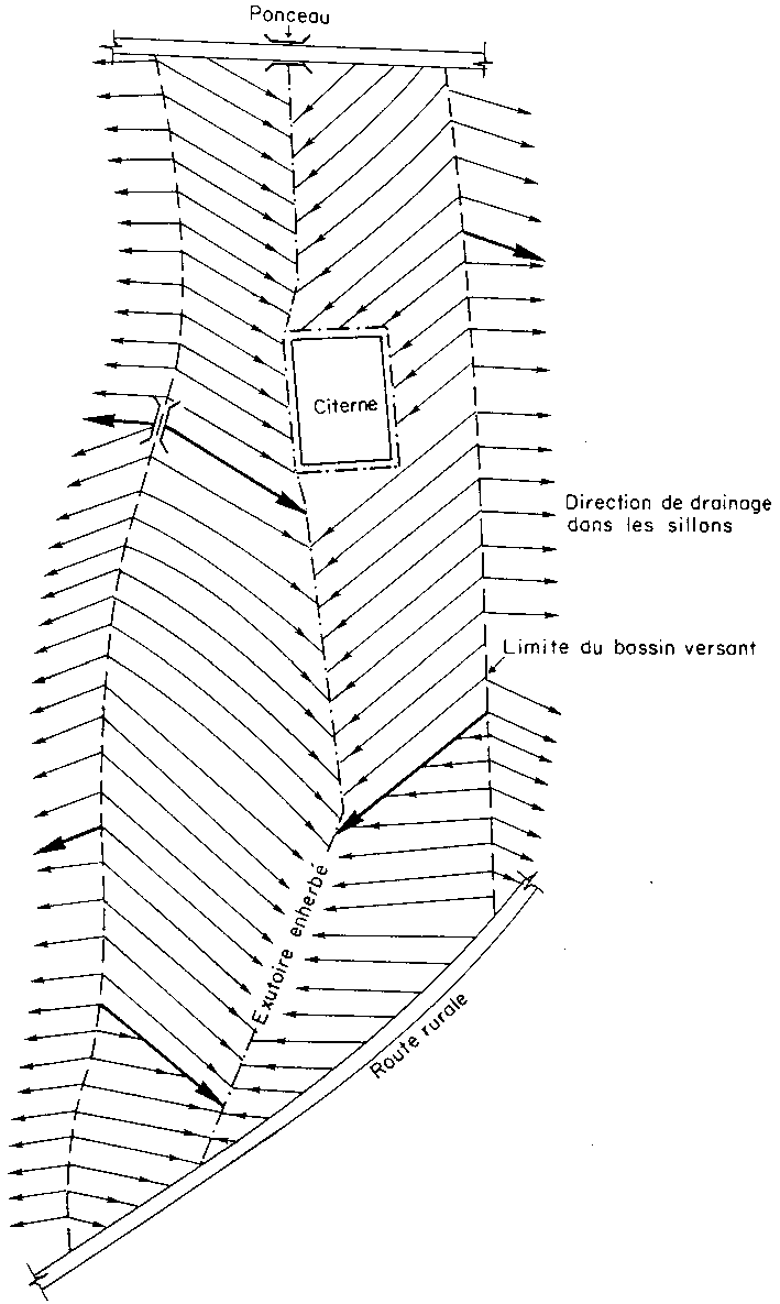 Lorsque les eaux de pluie sont trop abondantes ou trop intenses pour être stockées ou infiltrées totalement dans le sol, on organise leur drainage dans des fossés, le long de diguettes, banquettes ou des terrasses de diversion (figure 45) pour récupérer les nappes ruisselantes avant qu'elles aient acquis une énergie suffisante pour raviner le versant. Ces eaux de ruissellement sont alors évacuées en dehors de la zone de culture vers des exutoires naturels ou des exutoires qu'il faut aménager, en leur permettant d'atteindre le niveau de base de la rivière sans créer de dégâts trop importants.