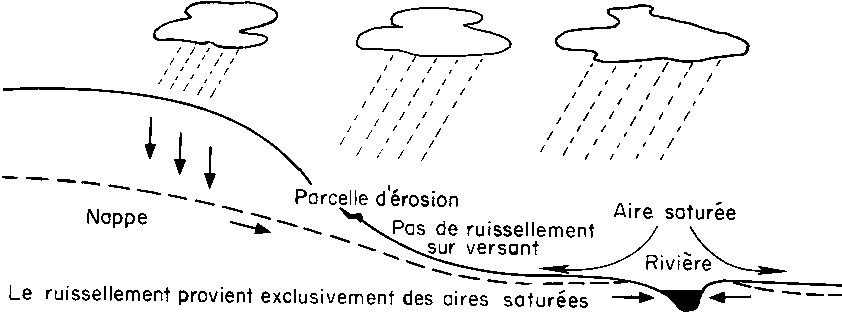 3° Théorie de la contribution partielle de la surface du bassin au ruissellement. A la figure 54c, on constate que le ruissellement observé au niveau de la rivière est fonction de la surface du sol saturé au fond de la vallée. Si, au cours de la saison sèche, on mesure le ruissellement sur un bassin versant, on constate que la rivière réagit très rapidement aux orages alors qu'on n'observe pas de ruissellement sur les versants ! Le volume ruisselé est réduit pendant cette période sèche car la surface saturée du fond de vallée est très étroite, souvent réduite au lit mineur. En fin de l'hiver, par contre, lorsque tout le volume de la couverture pédologique a été réhumecté jusqu'à capacité au champ, la moindre averse réalimente la nappe, laquelle va latéralement saturer une surface plus grande de la vallée. Par conséquent, même s'il n'y a pas de ruis sellement sur le versant en période humide, l'ensemble du bassin versant va contribuer au volume écoulé par la rivière par extension de la surface saturée, la nappe étant alimentée directement par le drainage de l'ensemble du bassin.
