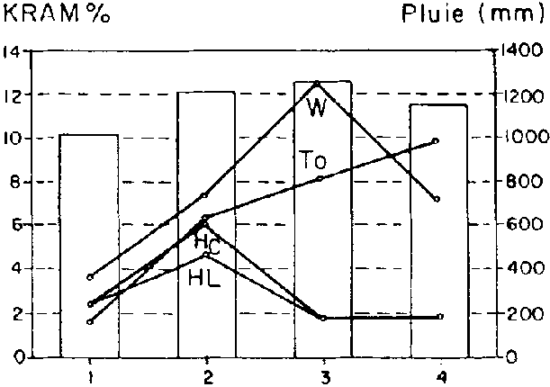 Les pertes en terre: L'érosion en nappe et rigole décroît de 450 t/ha/an sur jachère nue à 80-120 t/ha/an sur cultures traditionnelles et 1 à 2 t/ha/an sous cultures, deux à trois ans après plantation de haies vives. Il faut noter que les cultures ont reçu 10 t/ha/an de fumier de ferme (et même 90 t/ha la troisième année). Même un tel apport de fumier n'a pas suffi à réduire l'érosion à un niveau tolérable: mais si l'érosion a tendance à augmenter d'année en année sous culture traditionnelle, elle diminue sur les parcelles protégées par des haies vives, à mesure que la pente du terrain cultivé diminue (de 27 à 15 %).
