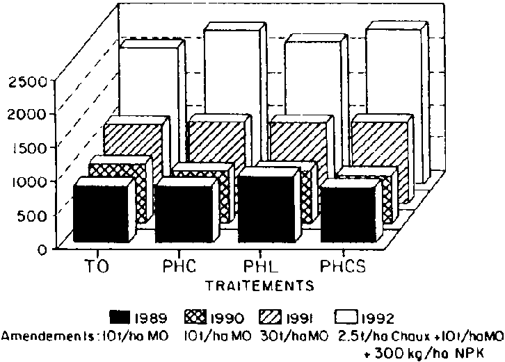 Dans cet essai sur sol ferrallitique acide, il semble que même si l'érosion et le ruissellement sont maîtrisés, la productivité continue à décroître ! Dix tonnes de fumier plus six tonnes de paillis de légumineuses n'ont pas suffi à augmenter significativement les rendements des céréales et haricots, car les plantes, les sols, les animaux et les fumures organiques sont carencés dans les mêmes éléments (surtout P et N). Par contre, on a pu tripler les rendements et valoriser les travaux de lutte antiérosive après correction du pH (2,5 t/ha/3 ans de chaux ont suffi pour éteindre la toxicité aluminique) et apport minéral complémentaire (60 unités de NPK suffisent pour les céréales).
