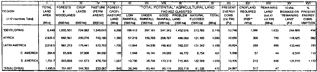"Total Potential" agricultural land definition (see above)Col. XII: Total present energy use: commercial + Fuelwood ONLY (FAO. "Forest Products Yearbook. 1989" Rome.)
