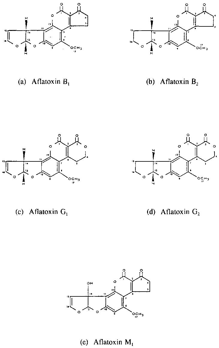 Mycotoxins have been implicated in a range of human and/or animal diseases and occur in a variety of grains. The ingestion of mycotoxins can produce both acute (short-term) and chronic (medium/long-term) toxicities ranging from death to chronic interferences with the function of the central nervous, cardiovascular and pulmonary systems, and of the alimentary tract. Some mycotoxins are carcinogenic, mutagenic, teratogenic and immunosuppressive. Aflatoxin B. (Figure 2.1. Chemical structures of the Aflatoxin group of mycotoxins.), for example, is one of the most potent hepatocarcinogens known.