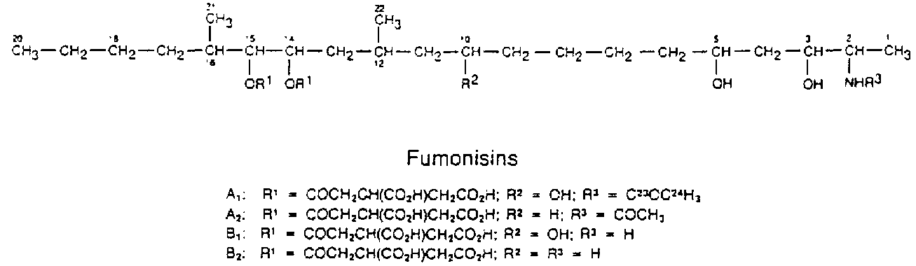The fumonisins are a group of mycotoxins which have been characterised comparatively recently (Anon, 1993(d). They are produced by F. moniliforme which occurs worldwide and is one of the most prevalent fungi associated with maize.