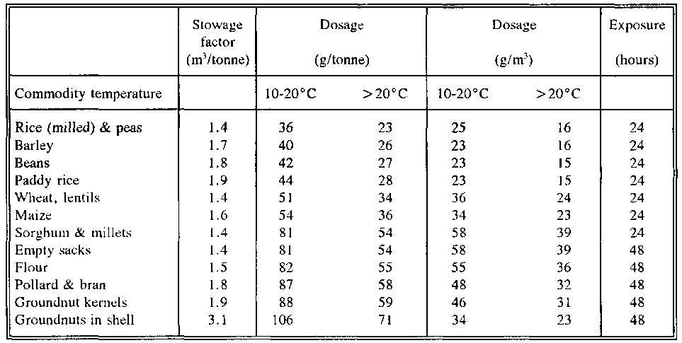 Recommended dosages are also given as g/m3 for situations where the volume, but not the weight, of the commodity is known. The volume dosages have been obtained by dividing the dosage per tonne by the stowage factor. These dosages are alternatives and should not be added together.