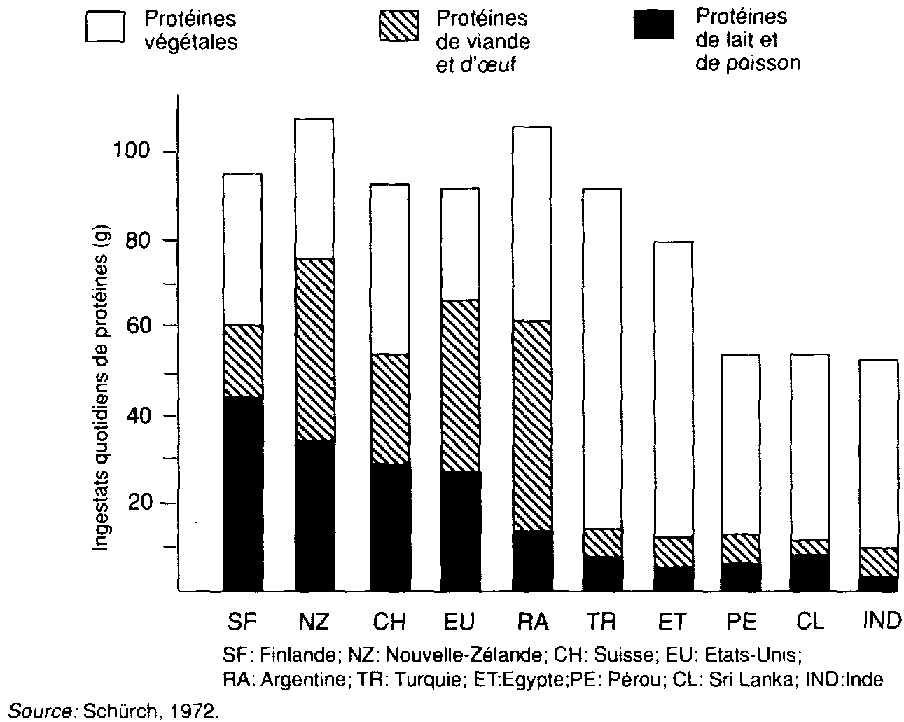 FIGURE 23 Consommations moyennes de protéines totales et de protéines végétales dans différents pays