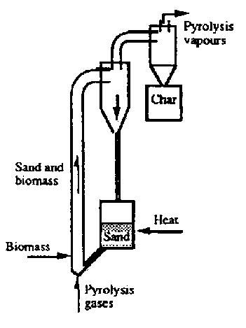 An upflow circulating fluid reactor has been operated by Ensyn in Ottawa, Canada (Graham, 1988). Fig.7.1b show that the biomass particles and pre-heated sand are fed together in the bottom section of the circulating fluid reactor. Unfortunately there is no literature available reporting the dimension and the flow rates of the preheated carrier gas and sand for this process. Typical operation of this reactor are a temperature 600 ° C and a biomass throughput of 100 kg/h. It is claimed 60% bio-oil can be achieved with poplar wood as the feed stocks. The use of the sand as a heat carrier offers the advantage of a compact construction because of the high heat transfer rate from the sand to biomass particles. Another advantage is the short residence time of gas, by which secondary tar cracking is suppressed. When this reactor becomes scales-up, special attention should be pay to the rapid mixing of biomass particles with solid heat carrier. Again the requirement of carrier gas is a disadvantage.