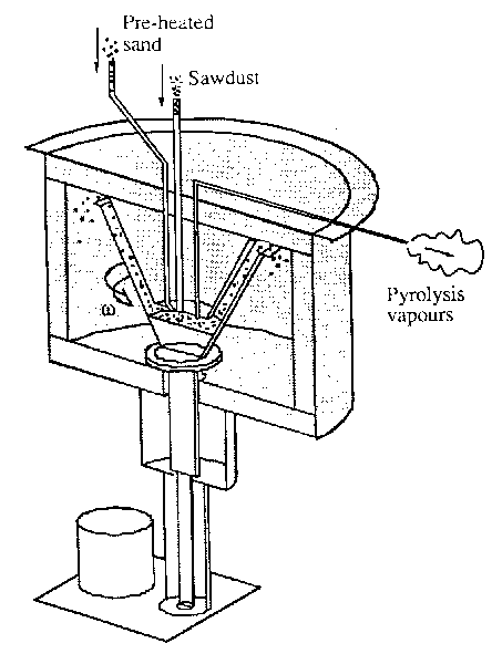 The vacuum pyrolysis of aspen polar in a multiple hearth reactor has been studied by Roy et al (1992, 1993) at the University of Laval, Quebec, Canada. Six heated hearths with a diameter of 0.7 m are staked on top of a total height of 2 m as part of the reactor given in Fig.7.1c. Wood is fed into the top compartment of reactor and transported downwards by gravity and by the action of scrapers which at present in each compartment. If the biomedicine is converted completely, the bottom compartment contains only charcoal which can be easily removed from the reactor. The temperature of top hearth is about 200 °C and increases towards the bottom the reactor where it reaches 400 ° C to achieve a maximum bio-oil products. A vacuum pump is used to keep the reactor pressure at a value of 1 KPa. A difficulty in scaling -up the reactor is necessary installing a large capacity vacuum pump which is sensitive to fouling and also it is very expensive.