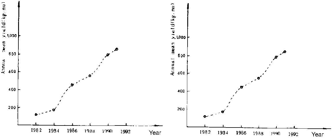 With the ten year construction, XinNong village's ecological environment has been changed a great deal. Agricultural production has increased rapidly. The grain per mu yield in 1991 was 860 kg which was eight times as much as that in 1980. The details are shown in Fig.1.