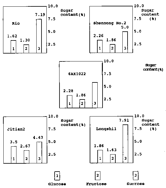 From Tab.4.1.2, it can find that the brix degrees are different in every internodes, the tendency is low-high-low from top to low position, and most