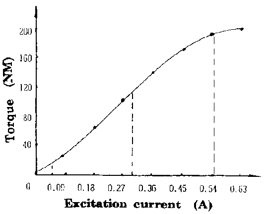 When excitation current is increased to 0.54 A and then gradually decreased to zero from 0.54 A, torque is measured 3 seconds after the variation of current, as shown in Fig 5.24. The torque difference due to magnetic hysteresis reduces with time extension. Torque difference nearly disappears after the current has been changed for 7 seconds.