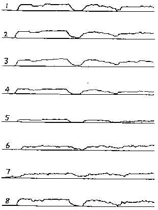 To evaluate the simulating property of the MPB, tests of duplicating load cycle were conducted when the loading vehicle was stationary. The SBM was timed to output data of the sample load cycle through the DAC0832, offer excitation current for MPB and measure brake torque on the PTO shaft of the loading vehicle. Test results are shown in Fig 5.25. Curves 1 to 3 were duplicated with loading intervals of 360 ms, 240 ms and 180 ms respectively. Curves 4 and 5 were obtained with intervals of 240 ms while the sample load cycle was reduced by 1/4 and 1/2 respectively.