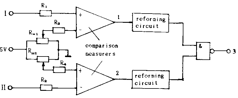 Some transducers output two sine waves. As the measured parameter changes, the phase angle of the two sine waves varies proportionally. The CJQ rotational distance & rotational speed transducer manufactured by Haian Electrical Machinery Factory, Jiangsu province, China, is made on the magneto conversion principle. With the increase of the torque exerted on its shaft, the phase difference enlarges proportionally. The circuit for surveying the phase difference is shown in Fig 5.29. Fig 5.30 depicts the procedure of signal conversion. Two comparison measurers are used in Fig 5.29 to generate square waves SA and SB from sine waves output by the transducer. Then, the square waves are reformed. When they pass through the AND. NOT gate (Fig 5.29), Sc (Fig 5.30) is obtained. The time duration t that represents the phase angle