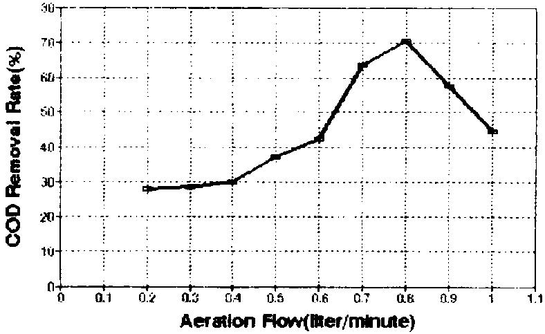 According to Fig.5, when the aeration flow ranges from 0.2 to 0.4 liter/min, the effect of the aeration flow on the COD removal rate is insignificant. Within a range of 0.4 to 0.8 liter/min, the COD removal rate becomes increasingly rapid. The COD removal rate peak is obtained when the aeration flow is 0. 8 liter/min. After exceeding 0.8 liter/min, the COD removal rate decreases sharply with the aeration flow down and with some suspended flocculi found in the effluent.