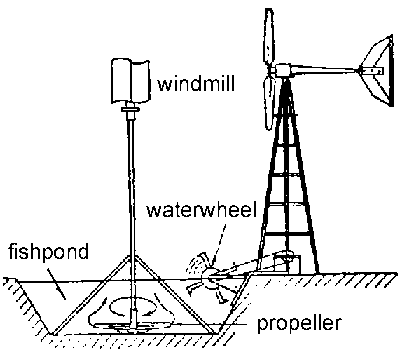 A schematic outline for jetting water aeration by using a windmill to drive a pump is shown in Fig. 4. A pump which is driven by a windmill lifting water from a river and jetting it into a fishpond. When the water in the fishpond is excessive, some old water can be drained off. Therefore, the advantage of this type equipment is that the water in the fishpond is continuously being replaced by fresh water during the oxygen-enhancing process.