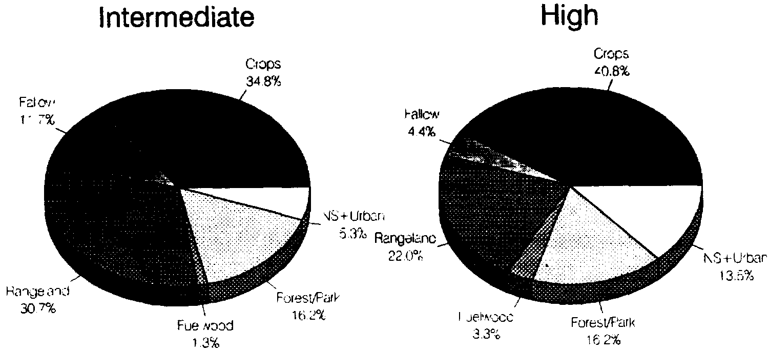 It is interesting to note that a change in input level leads not only to an overall increased production level, but also results in altered proportions of land used for different production purposes. For instance, the amount of rangeland reduces notably; this is due to more productive (feed efficient) livestock systems and increased availability of crop residues and by-products. Also, an increased share of feed supply must be provided from primary crops, e.g., feed grains. Fallow requirements are reduced under high input level; on the other hand, extents not suitable for agriculture increase because of more severe slope limitations. Figure 4.2 compares land-use by major categories under scenario F. at intermediate and high input levels.