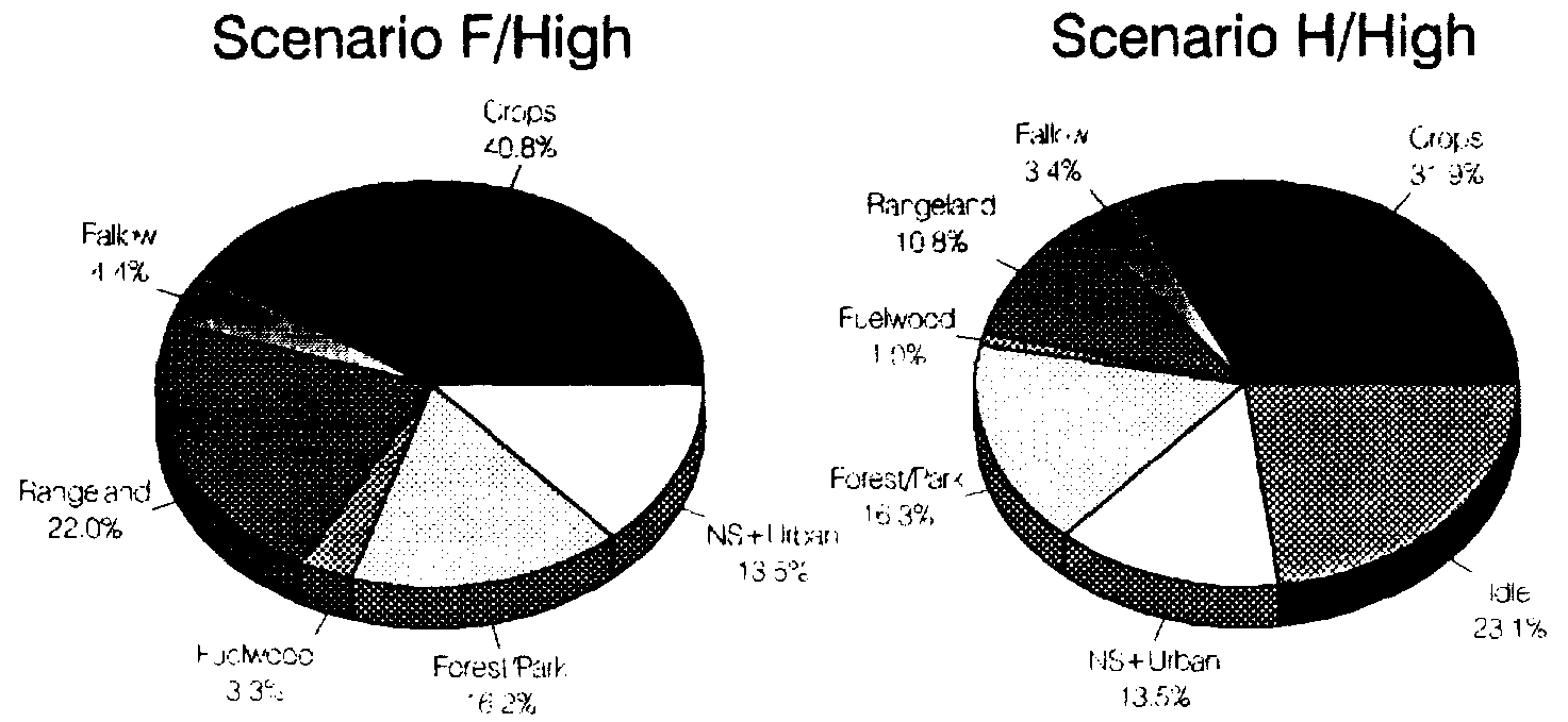 Figure 4.3 compares land use obtained under scenario F (maximize food production according to preferred target levels) and scenario H (minimize use of arable land subject to meeting demand targets in year 2000), both under high level of inputs.