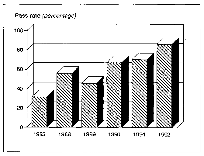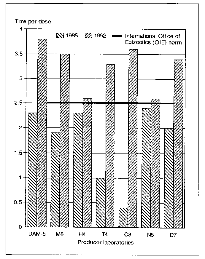 Training is of paramount importance to the successful introduction of new technologies, techniques and standards in vaccine production and quality control. FAO and UNDP have always been committed to providing support to training activities through national and regional training courses and fellowship awards. PANVAC's training programme can be considered a continuation of this theme. Before the establishment of PANVAC and the subsequent launching of its training programmes, the quality of rinderpest vaccine produced by African vaccine production laboratories was relatively poor. The first round of testing performed in 1985 indicated the critical need for training in vaccine technologies. In comparing the performances of production laboratories during the period from 1985 to 1992, it is obvious that the PANVAC training scheme has resulted in a substantial improvement, both in terms of potency value and in the proportion of final products that passed independent quality evaluation (Figures 2 and 3).