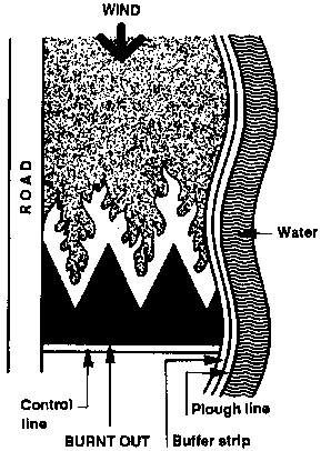 The pre-burn work is often done by a crew consisting of a leader, a tractor operator and a clean-up person. The job is to locate and establish control lines to accomplish the objectives of the burning plan best. To do this job skilfully, the preparation crew must have full information on the bum objectives, site conditions and weather elements. The control lines should use natural barriers like existing roads and cultivated fields as much as possible. Ploughing should be kept to a minimum and on contour lines wherever possible. Control lines should be placed to create logical, one-day burns.