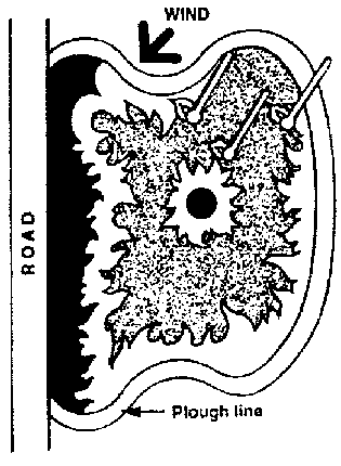 The pre-burn work is often done by a crew consisting of a leader, a tractor operator and a clean-up person. The job is to locate and establish control lines to accomplish the objectives of the burning plan best. To do this job skilfully, the preparation crew must have full information on the bum objectives, site conditions and weather elements. The control lines should use natural barriers like existing roads and cultivated fields as much as possible. Ploughing should be kept to a minimum and on contour lines wherever possible. Control lines should be placed to create logical, one-day burns.