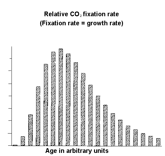 Forest growth is usually described in terms of annual yield over a given period. In many cases this has led to the misunderstanding that trees grow at a constant rate. This is very far from the truth, as can be seen from the schematic presentation of incremental annual growth of the tree biomass as a function of age in the Figure. Since rate of CO2 absorption is directly proportional to the rate of growth, it stands to reason that "preservation" of natural forests is a relatively inefficient means of sequestering CO2. On the other hand, forest management based on harvesting at the optimal rotation, efficient conversion of the wood into durable products and appropriate regeneration would maximize the sequestering of CO2.