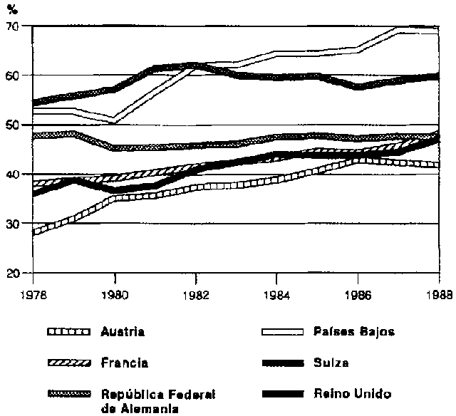 Hay numerosos países en que la recuperación alcanza, o incluso excede, el 50 por ciento del consumo aparente de papel y cartón, a saber: Austria, Chile, Checoslovaquia, Japón, Países Bajos, Suecia y Suiza. La mayor parte de los restantes países, desarrollados y en desarrollo, recuperan entre el 20 y el 40 por ciento. En unos cuantos países - Bolivia, Túnez, Jordania, Myanmar y Nueva Zelanda - la recuperación es inferior al 20 por ciento. Es digno de mención el hecho de que aun siendo relativamente elevada la recuperación en muchos países en desarrollo, la mayoría de los países en que la tasa de recuperación es inferior al 20 por ciento son países en desarrollo.