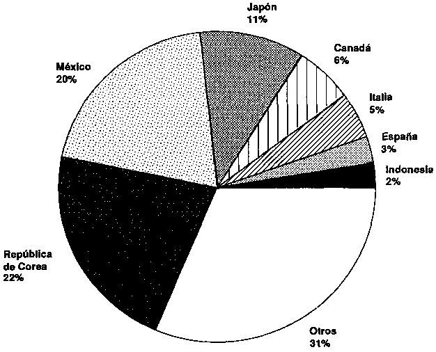 Aproximadamente el 15 por ciento del papel de desecho que se recupera - 10 millones de toneladas en 1988 - entra en el comercio internacional; los Estados Unidos originan actualmente más del 50 por ciento. La Figura 3 indica los principales países que reciben esas exportaciones de los EE.UU. Nótese que tres países en desarrollo México, la República de Corea y la provincia china de Taiwan - importaron más de un millón de toneladas de papel de desecho de los EE.UU. en 1988.