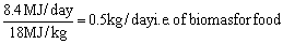 We have seen that a person needs in his food ca. 2,000 kcal per day (cf. example 13.1). This is 8.4 MJ/day for one person. We assume that the food mainly consists of crop products, i.e. biomass.
