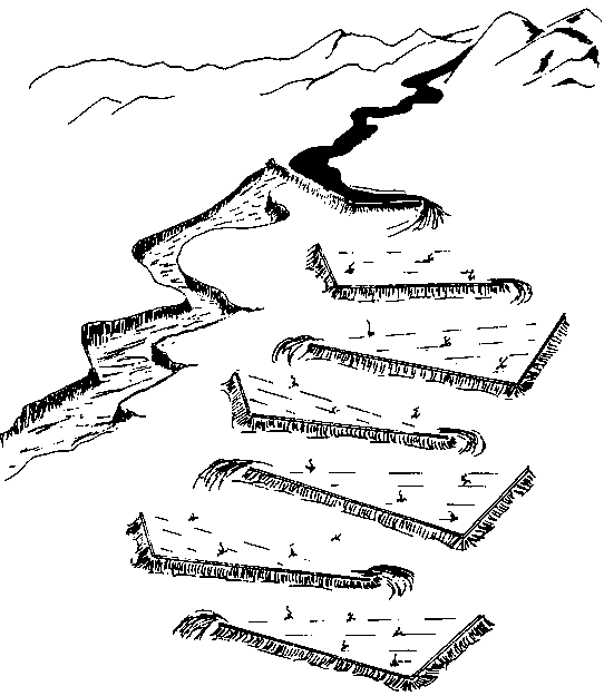 Permeable rock dams are similar in many respects to the "terraced wadis" traditionally used in North Africa and the Middle East. However, the terraced wadi system is used in more arid regions, across clearly defined watercourses (Gilbertson 1986; Reij 1988). Cross-wadi walls of stone retain runoff to depths of up to 50 cm, with the excess flowing over spillways into successive terraces below. Crops and fruit trees utilize the residual moisture.