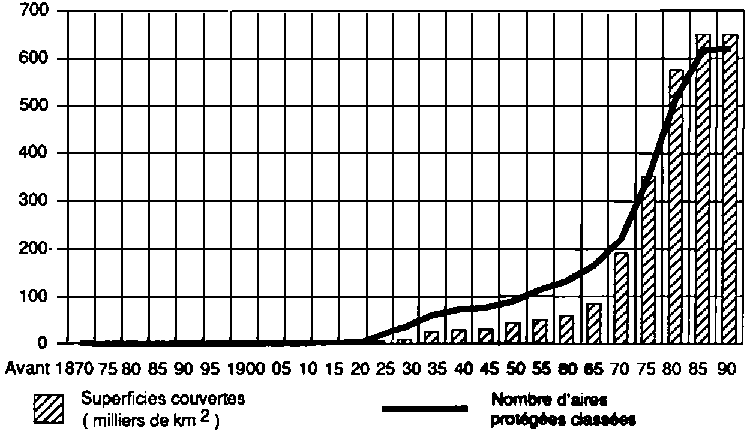 On a assisté à un vaste mouvement de classement d'aires protégées dans les années 70 et 80 (voir figure 1), et la liste la plus récente des Nations Unies (UICN, 1980) comprend 669 aires protégées dans le biome de forêt tropicale humide de plaine, couvrant environ 66 millions d'ha (voir tableau p.44). Il s'agit de surfaces comprises dans les limites de ce biome tel que défini par Udvardy (1984) et entrant dans les catégories d'aires protégées 1 à 4 de l'UICN, dans lesquelles aucune utilisation humaine importante n'est autorisée. Toutes ces aires protégées ne sont pas entièrement boisées, et il est probable que 5 pour cent seulement du biome sont soumis à cette forme de protection totale.