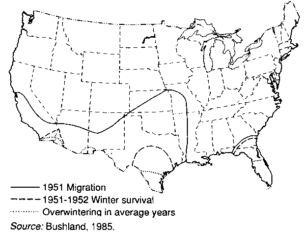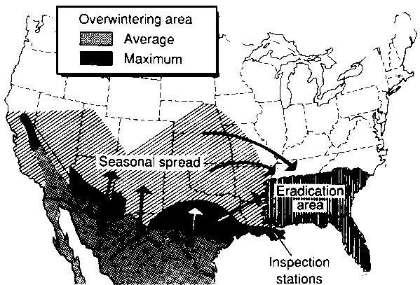 Prior to its eradication in the United States, the screwworm, Cochliomyia hominivorax (Coquerel), existed in tropical to subtropical environments, with populations surviving the winters in southern Florida, Texas, California and Arizona (see Figure 1). Variations in the weather from year to year determined the degree of population reduction each year in overwintering areas. During the spring, summer and autumn the Screwworm population increased with a commensurate increase in territory occupied (Knipling and Travis 1937). Screwworms were commonly reported in the central United States, with occasional cases as far north as the border with Canada.