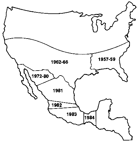 As a result of producer interest, the eradication programme was expanded to encompass the southwestern United States (Scruggs, 1975), (see Figure 3). Objectives were to prevent the reintroduction of screwworms into the southeastern United States; to eradicate screwworms from Texas, Arizona and California; and to prevent reinvasion into the United States from Mexico.