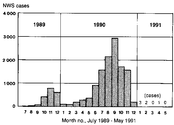 NWS cases in Libya, July 1989 to May 1991 - Cas de lucilie bouchère en Libye de juillet 1989 à mai 1991 - Casos de presencia del gusano barrenador del ganado en Libia, de julio de 1989 a mayo de 1991