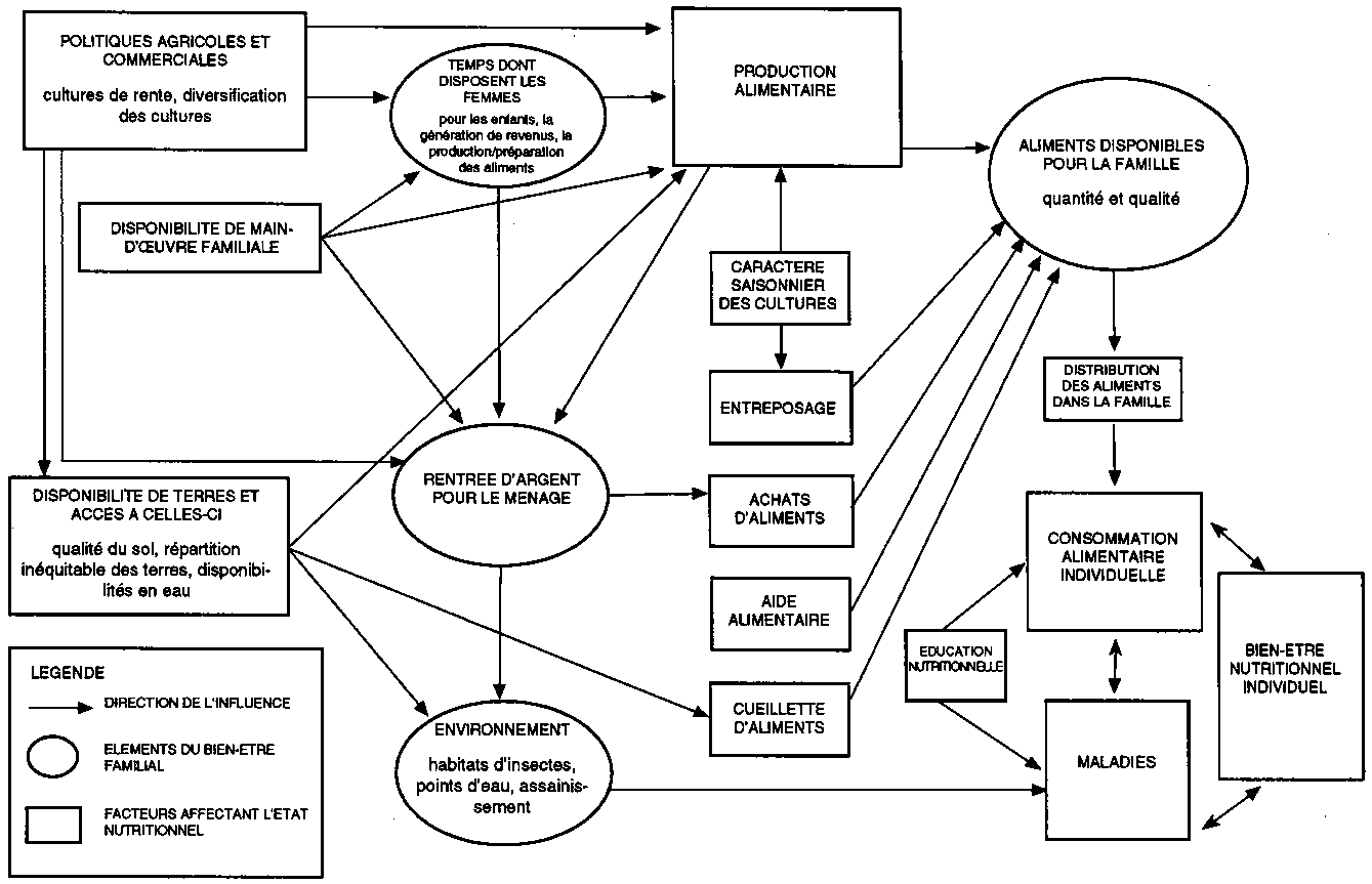 La quantité et la qualité des aliments consommés par un individu sont déterminées essentiellement par le niveau et la variété des disponibilités alimentaires au sein de la famille. Ces disponibilités incluent les aliments produits, stockés, collectés, achetés ou encore ceux fournis au titre de l'aide alimentaire. De nombreux facteurs différents affectent la quantité et la qualité des aliments produits et achetés, à savoir les politiques commerciales (1), les systèmes de tenure (2), la disponibilité de main-d'uvre, le temps dont disposent les femmes (3) et les revenus monétaires. Il ne faut pas sous-estimer l'importance des réserves alimentaires, compte tenu du caractère saisonnier de la production et de la récolte des produits vivriers. Les installations d'entreposage et les techniques de conservation des aliments jouent un rôle déterminant dans les disponibilités alimentaires du ménage.