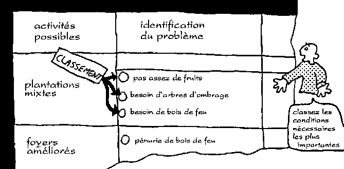 Avec l'aide des intervenants extérieurs, les membres de la communauté identifient les conditions nécessaires à la réalisation des activités. Ils collectent également les données essentielles qui leur permettront de déterminer si leur communauté dispose de ces conditions ou peut les créer. Grâce à un "cadre de travail pour le diagnostic", chaque activité est examinée en terme de conditions nécessaires et celles qui ne sont pas réalisables sont éliminées.