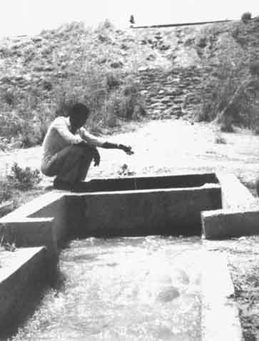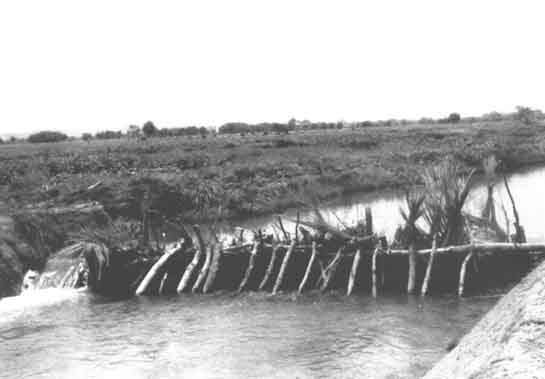 Figure 7 shows a weir made of local materials, which is constructed across a canal. The water level upstream is raised by some 20 cm and the flow is diverted to an irrigated plot through an offtake on the right bank. A low section of the structure functions as a spillway and discharges the surplus water downstream.